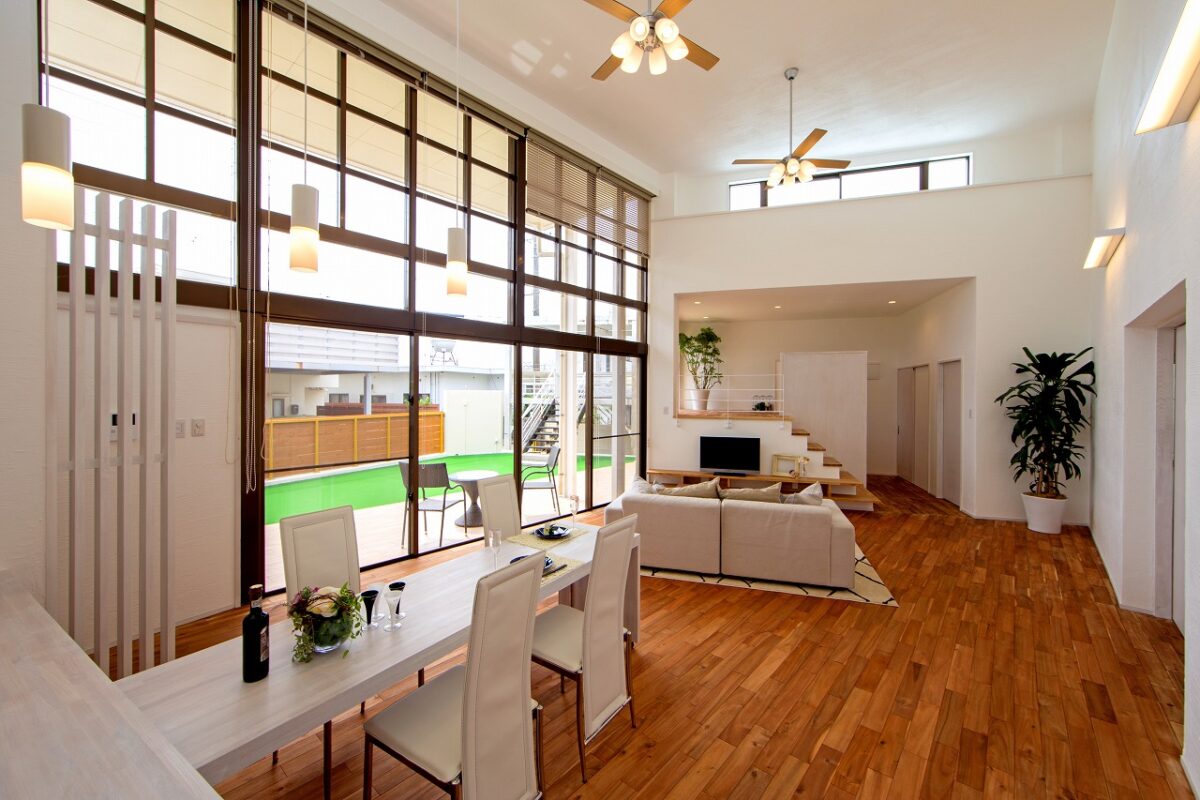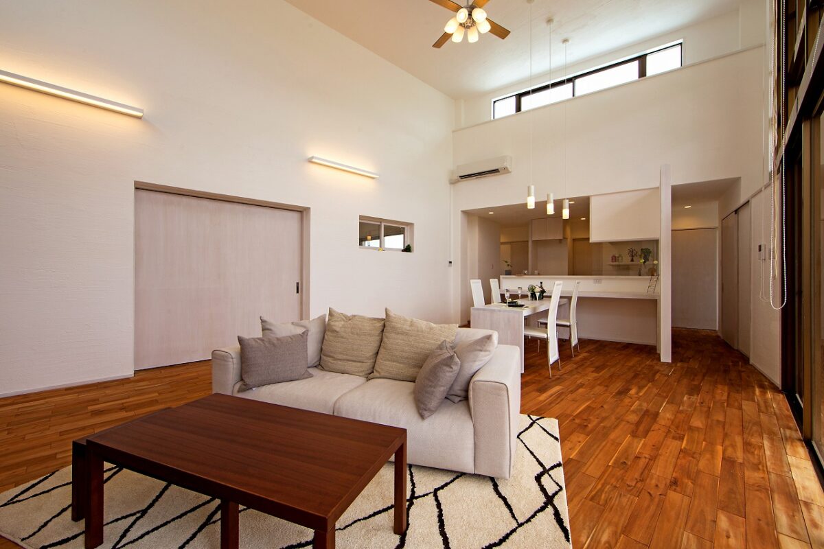 天井高4.8mの開放的なリビングの一角には、高さを生かした
