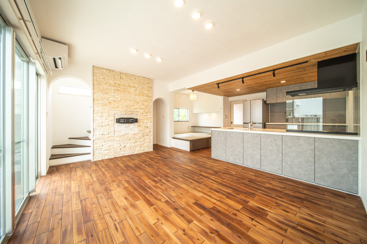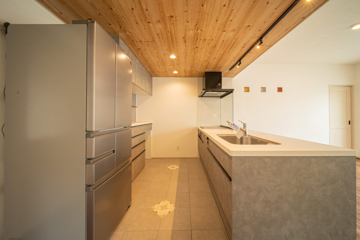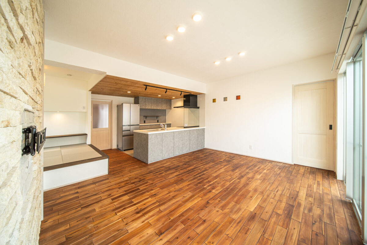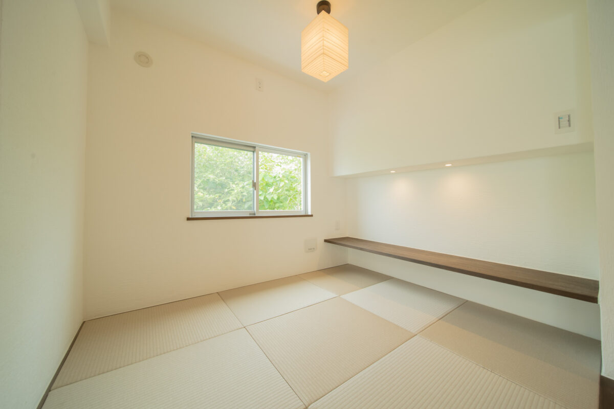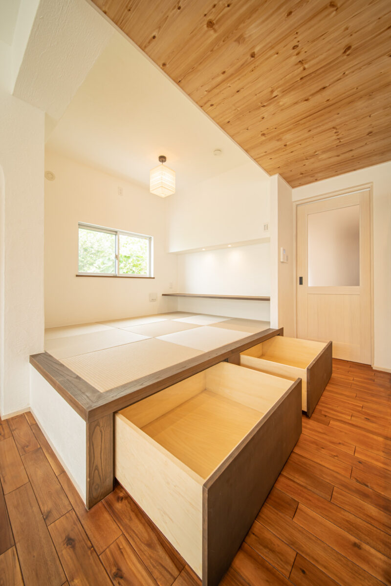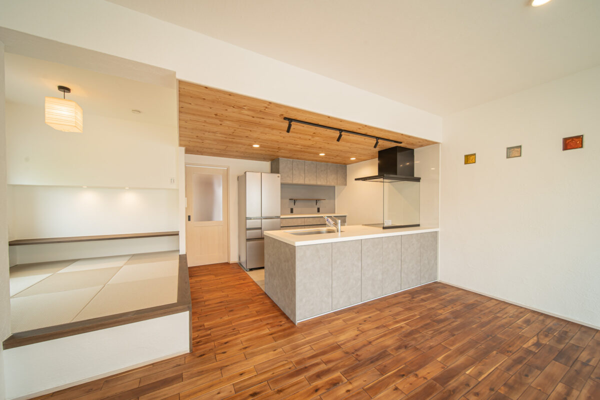 床面積40坪の2階建ては、お料理をしながらお子様の成長を見守れる、キッチン横に和室を計画した家。